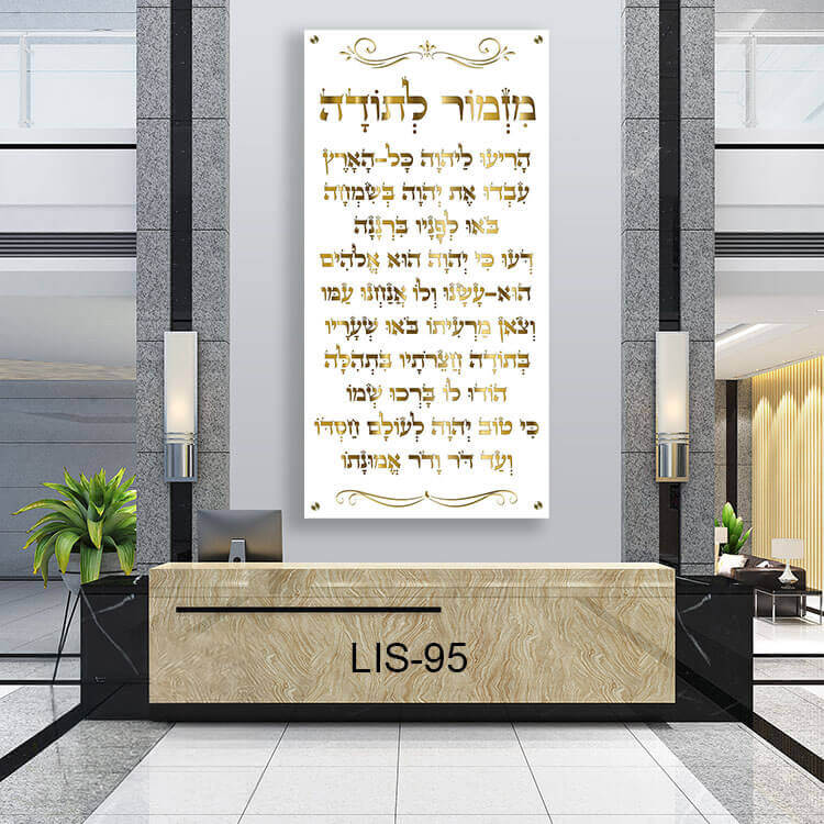 "מזמור לתודה" מסמל את הכרת הטוב וההודיה על שפע החיים, בעוד העיצוב הלבן-זהוב מוסיף לחלל תחושה של טוהר והרמוניה. זו בחירה מושלמת למי שמעוניין לשלב ערכים מסורתיים עם עיצוב עכשווי ומרשים.