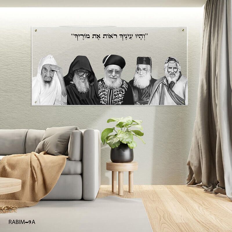 בדגם זה מופיעים גדולי הרבנים בשחור-לבן: הרב ישראל אבוחצירא (הבבא סאלי), הרב אלעזר אבוחצירא, הרב עובדיה יוסף (מרן), רבי מאיר שלום אבוחצירא (הבבא מאיר) והרב יעקב אבוחצירא (אביר יעקב). הרקע השקוף מדגיש את דמויות הרבנים ואת הפסוק "ויהיו עיניך ראות את מוריך", ליצירת מראה מודרני ואלגנטי שממזג עוצמה רוחנית עם עיצוב עכשווי. ההדפסה הישירה על זכוכית מחוסמת אקסטרה קליר בעובי 6 מ"מ מספקת עמידות גבוהה וברק איכותי, ההופך כל חלל למרשים ונעים.