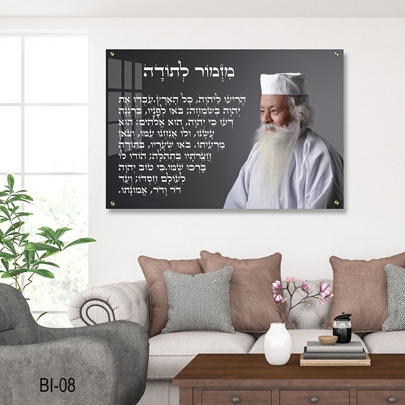 הכניסו ברכה, הודיה ואור רוחני אל ביתכם עם תמונת זכוכית מיוחדת המשלבת את דמותו המאירה של הרב מרדכי שרעבי זצ"ל יחד עם פרק התהילים המפורסם "מזמור לתודה". התמונה מציגה את הרב בפנים קורנות ובבגדי לבן המשרים טוהר, לצד הטקסט המלא של המזמור, המהווה סגולה להודיה על הטוב ולשמירה. שילוב זה הופך את היצירה לפריט יודאיקה ייחודי ובעל משמעות עמוקה.