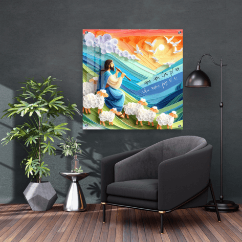 תמונת זכוכית ייחודית ומלאת השראה של רועה צאן, עומד בין כבשים על רקע צבעוני עוצמתי, עם הציטוט: